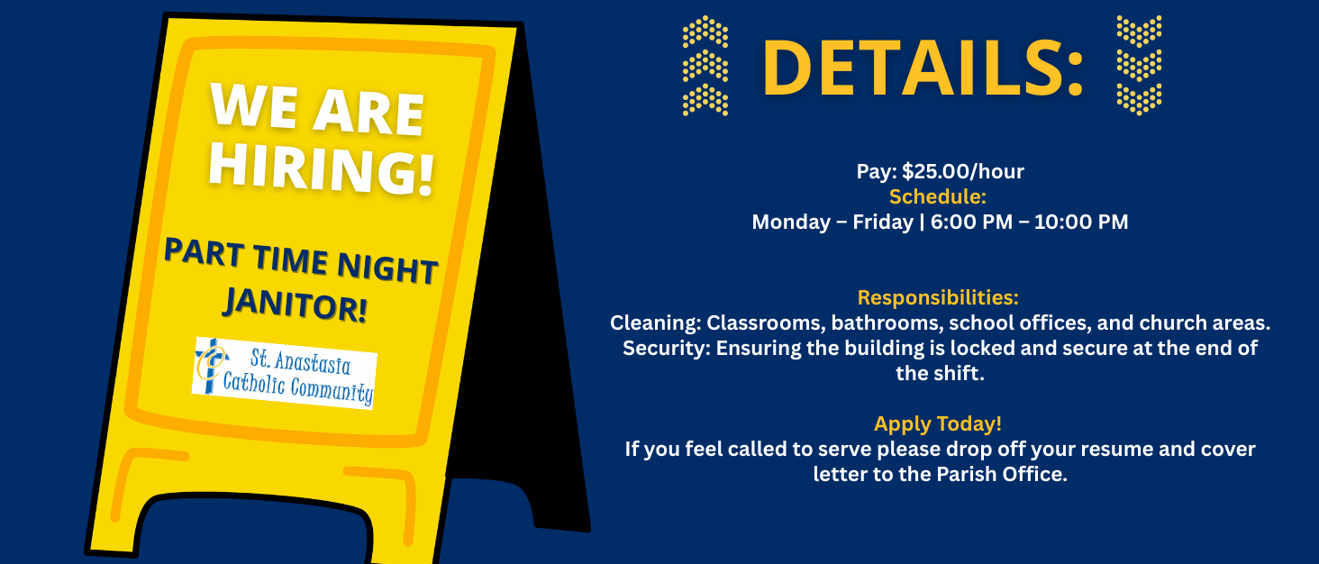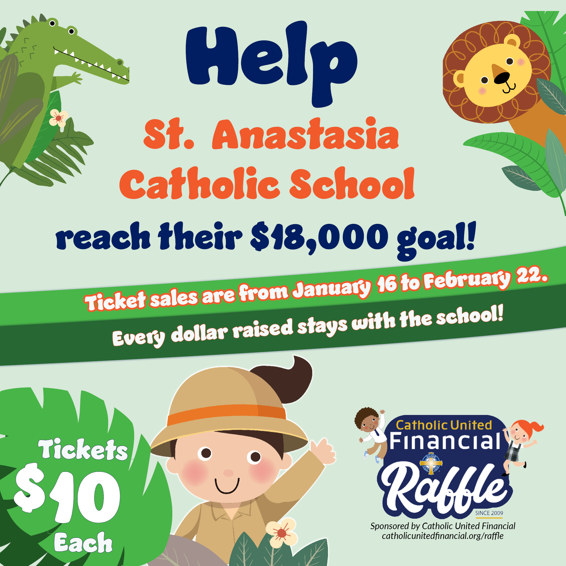 Tickets are $10 each, and the raffle features $30,000 in cash prizes. Tickets may be purchased from a St. Anastasia student or after all weekend Masses. We encourage you to buy a ticket, share the opportunity with friends and family, and thank you for being part of something bigger for our school community.