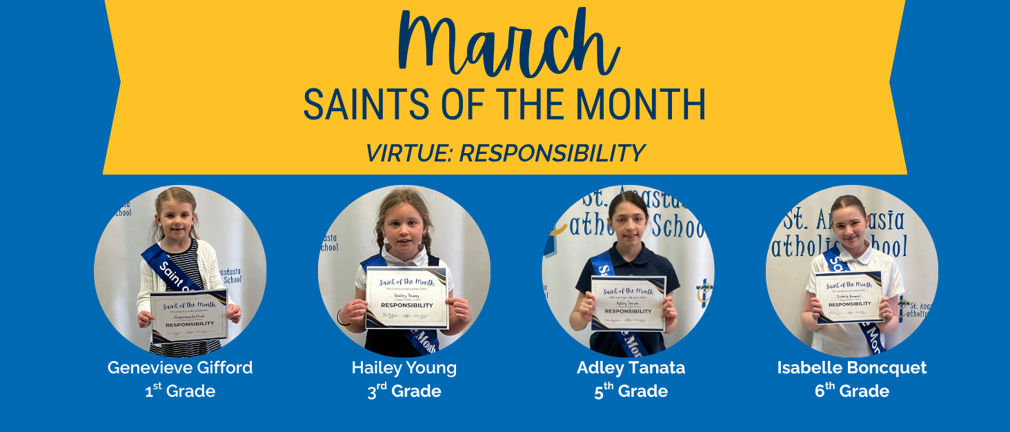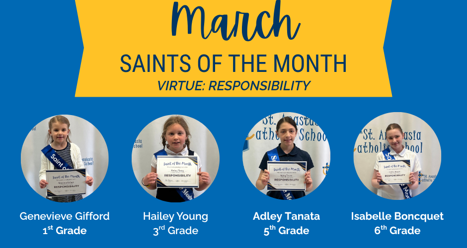 At St. Anastasia Catholic School, our Saint of the Month program recognizes students who demonstrate strong character, academic responsibility, positive attitudes, and a commitment to living out our monthly virtue.