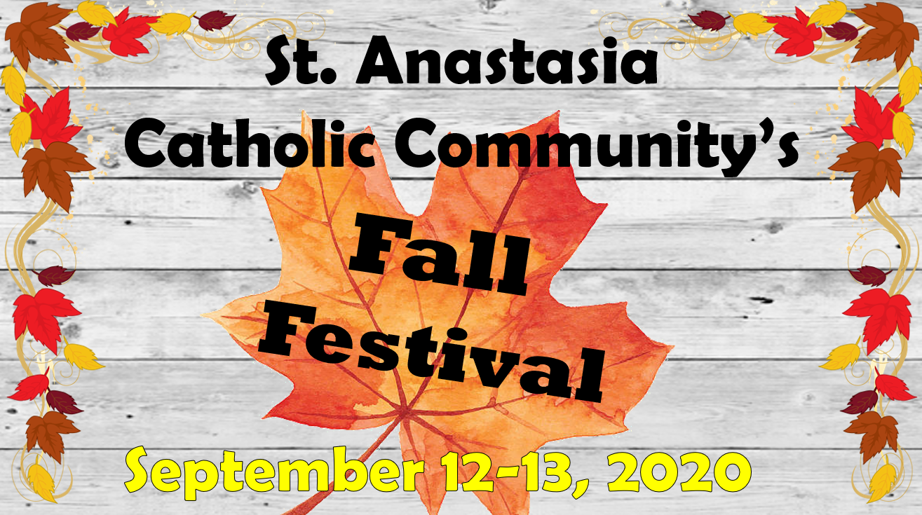 Purchase a St. Anastasia Fall Festival sign for $10.00 by 4:00 p.m., Friday, August 28, 2020. By 12:00 p.m. Sunday, August 30th, place the sign in a location that is highly visible to passersby. Between 12:00 p.m. on Sunday, August 30, 2020, and 9:00 p.m. Wednesday, September 9, 2020, take adventures as a family and record the addresses of as many signs as you can find. By 5:00 p.m. on Thursday, September 10, 2020, turn your list of addresses found in to the Parish Office. Winners will be determined first by the highest number of signs found and second (in case of a tie) by who turned in their list first. First place winning family will receive their choice of a $50 SCRIP card, Second place winning family will receive their choice of a $25 SCRIP card, and Third place winning family will receive their choice of a $10 SCRIP card.