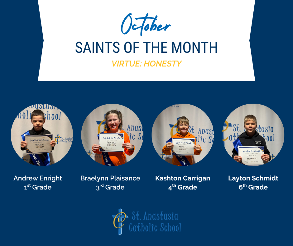 At St. Anastasia Catholic School, we’ve taken our Friendzy and Biblical Heroes program a step further by recognizing students who live out the virtues we focus on each month. Through our new Saint of the Month program, students who demonstrate strong character, a positive attitude, good behavior, academic responsibility, and embody the monthly virtue are honored for their exemplary behavior.